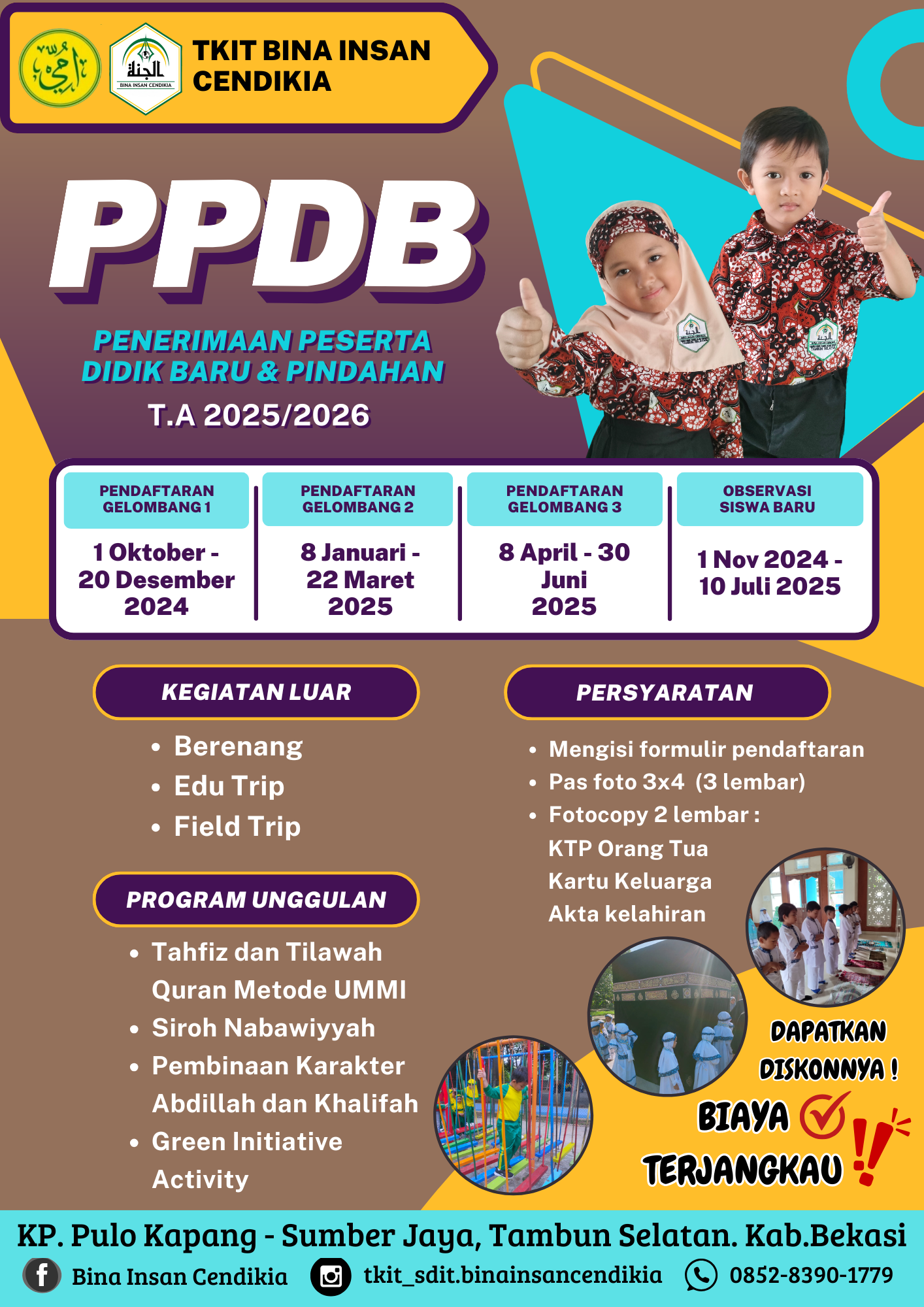 TKIT Bina Insan Cendikia Menerima Pendaftaran Siswa TK A dan TK B Tahun Ajaran 2025/2026. Biaya Formulir Pendaftaran Rp. 100.000.